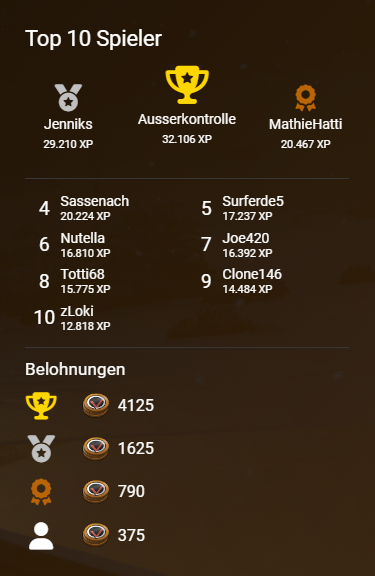 Ein besonderer Glückwunsch geht an die Spieler, die es in der letzten Season unter die Top 10 geschafft haben! Ihr Engagement und ihre Leistung haben beeindruckt. Die Belohnung in Form von Gutscheincodes wird im Laufe des Tages per Privatnachricht zugestellt.