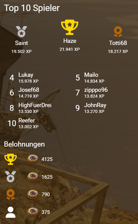Ein besonderer Glückwunsch geht an die Spieler, die es in der letzten Season unter die Top 10 geschafft haben! Ihr Engagement und ihre Leistung haben beeindruckt. Die Belohnung wird in den nächsten 24 Stunden den Benutzerkonto gutgeschrieben.