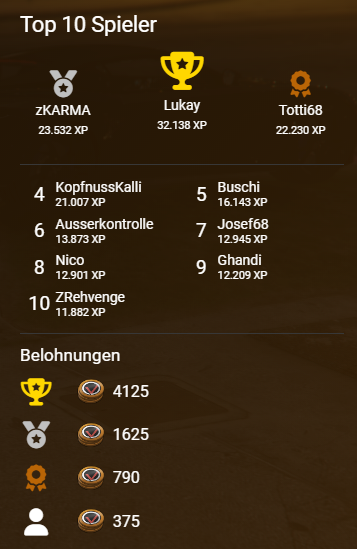 Herzlichen Glückwunsch an alle, die es in der letzten Season unter die Top 10 geschafft haben! Eure Leistung war beeindruckend – die verdiente Belohnung wird euch innerhalb der nächsten 72 Stunden gutgeschrieben.