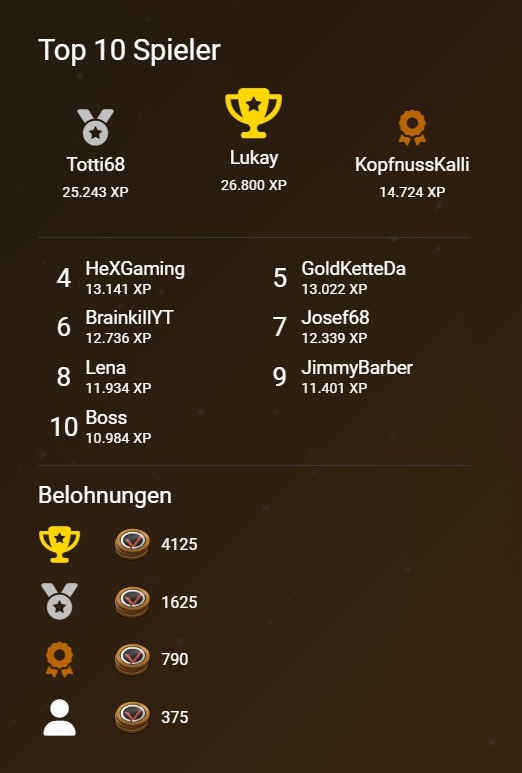 Ein großes Kompliment an die besten zehn Spieler der vergangenen Season! Eure herausragende Leistung wird natürlich belohnt! Die Belohnung wird innerhalb von 48 Stunden ausgezahlt.