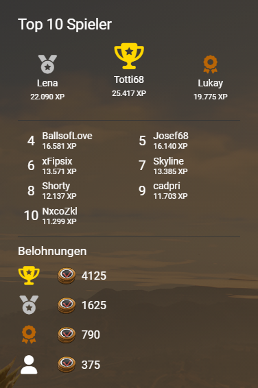 Herzlichen Glückwunsch an alle, die es in der letzten Season unter die Top 10 geschafft haben! Eure Leistung war beeindruckend – die verdiente Belohnung wird euch innerhalb der nächsten 72 Stunden gutgeschrieben.