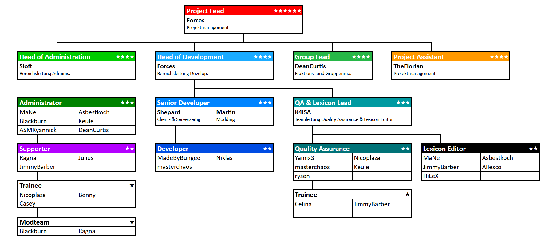 | Group Lead | Ansprechpartner der Fraktionen, Gruppen und Zivilisten im Bereich von administrativen und entwicklungstechnischen Angelegenheiten, Verwaltung Government & Vorschläge |
