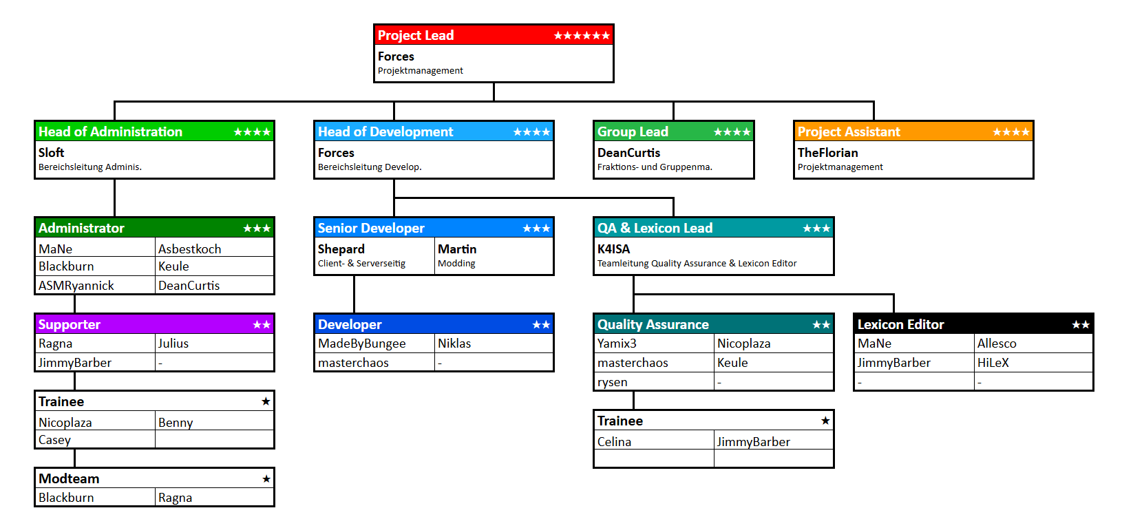 | Group Lead | Ansprechpartner der Fraktionen, Gruppen und Zivilisten im Bereich von administrativen und entwicklungstechnischen Angelegenheiten, Verwaltung Government & Vorschläge |