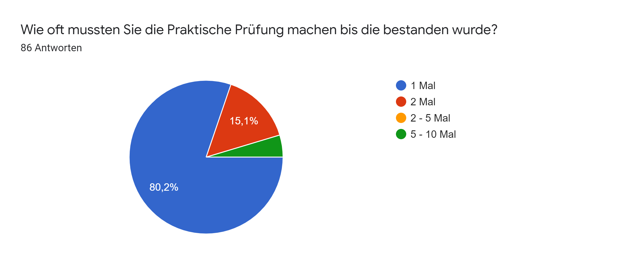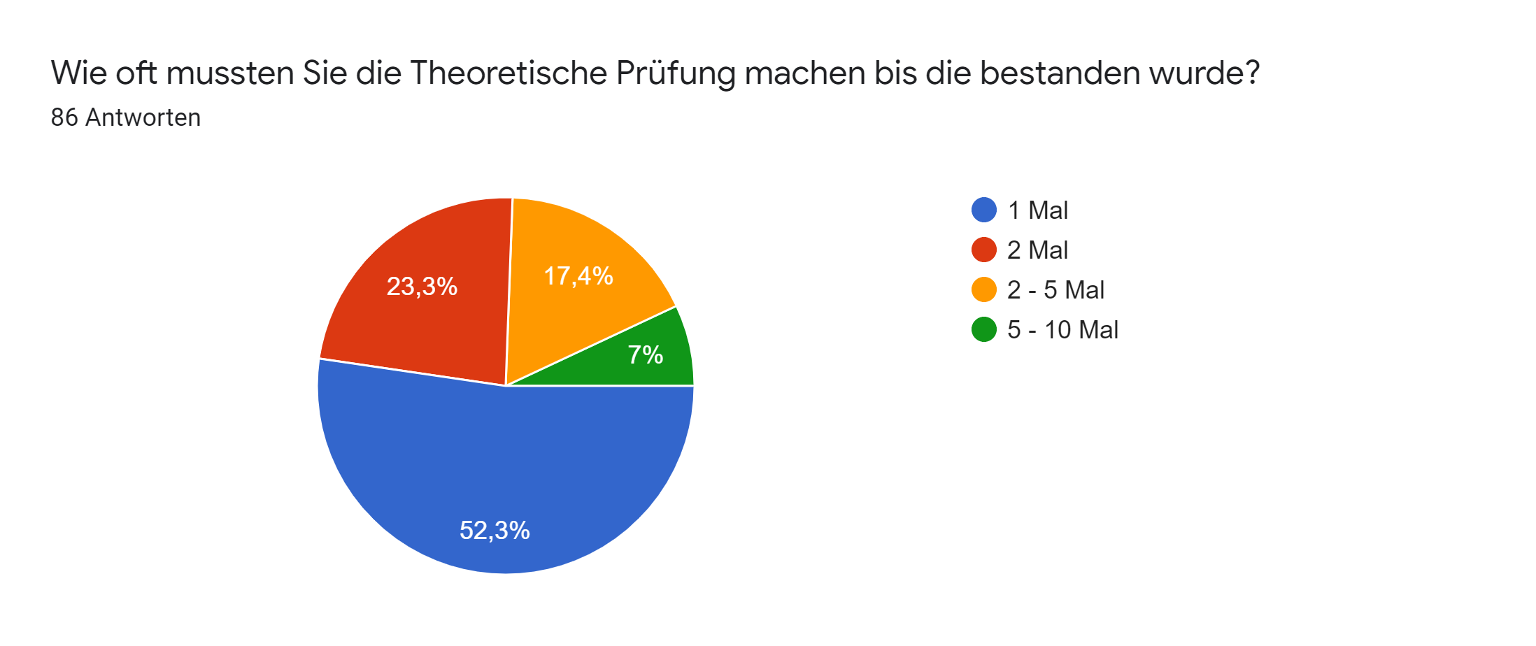 Bei der theoretischen Prüfung schaffen es 52,3% und bei der praktischen 80,2% beim ersten Mal, 23,3% sowie 15,1% brauchen zwei Anläufe. 17,4% mussten bei der theoretischen Prüfung zwei- bis fünfmal antreten.