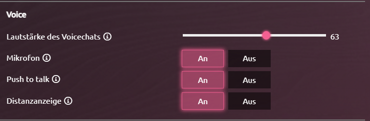 - Es kann die Distanzanzeige aktiviert oder deaktiviert werden. (Wenn diese Funktion aktiviert ist, kann man beim Sprechen den Radius des Voicechats sehen.)