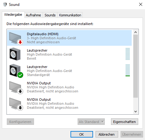 Das entsprechende Wiedergabe-/Aufnahmegerät sollte dort mit Rechtsklick als "Standard" eingestellt werden.