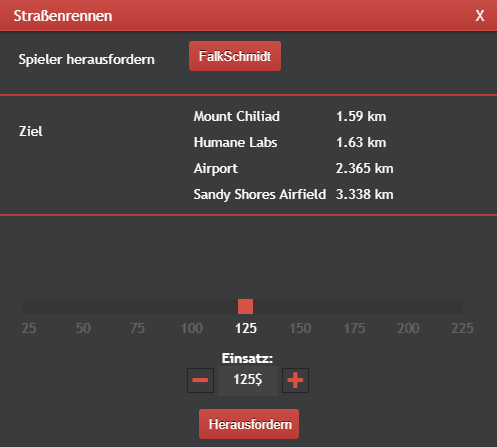 Der Einsatz kann zwischen $25 und $225 betragen. Wichtig dabei ist, dass ihr das Geld für euren Einsatz bar dabei habt! Nachdem die Herausforderung abgesendet wurde, erhält der Spieler eine Mitteilung im Chat.