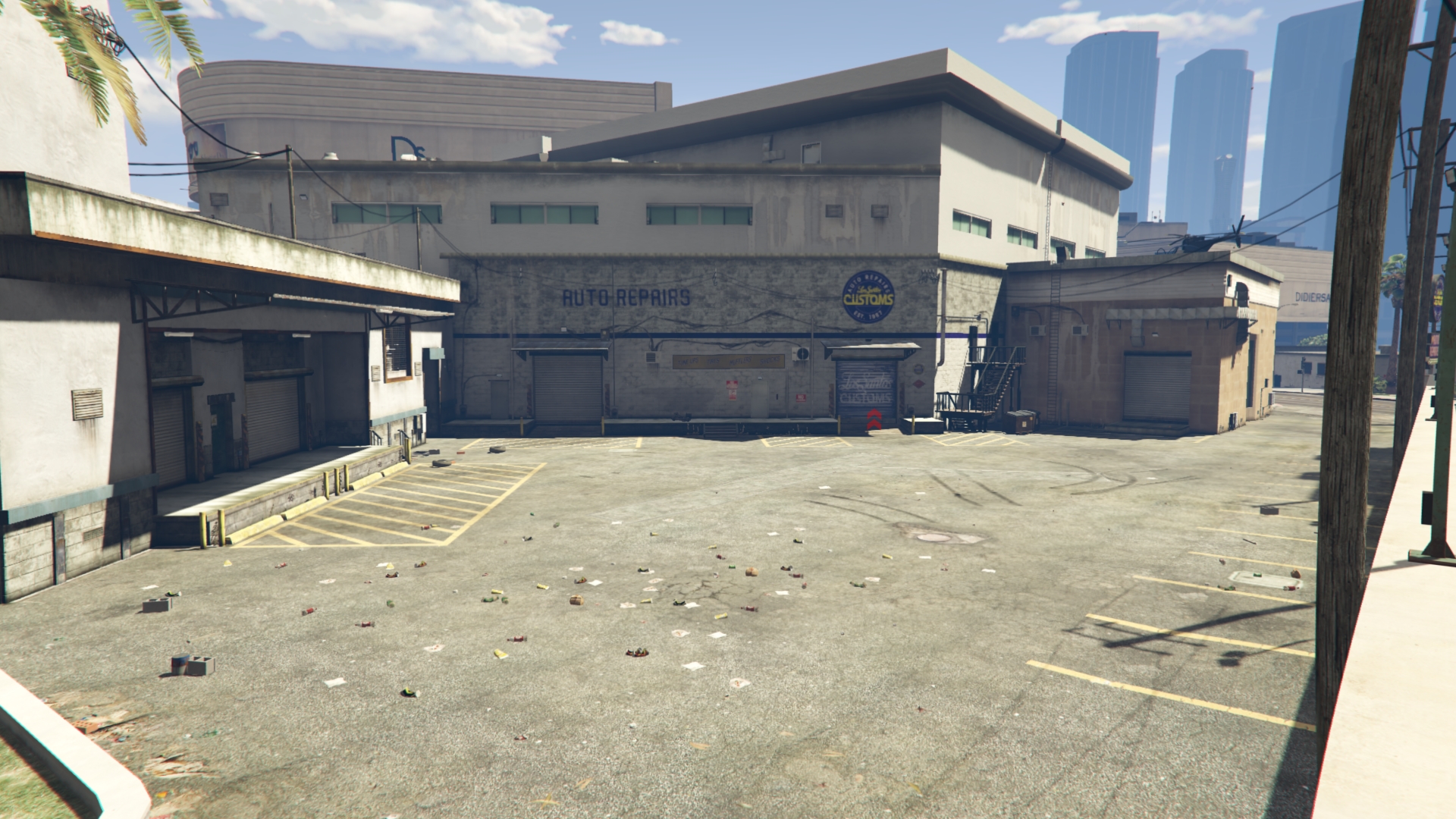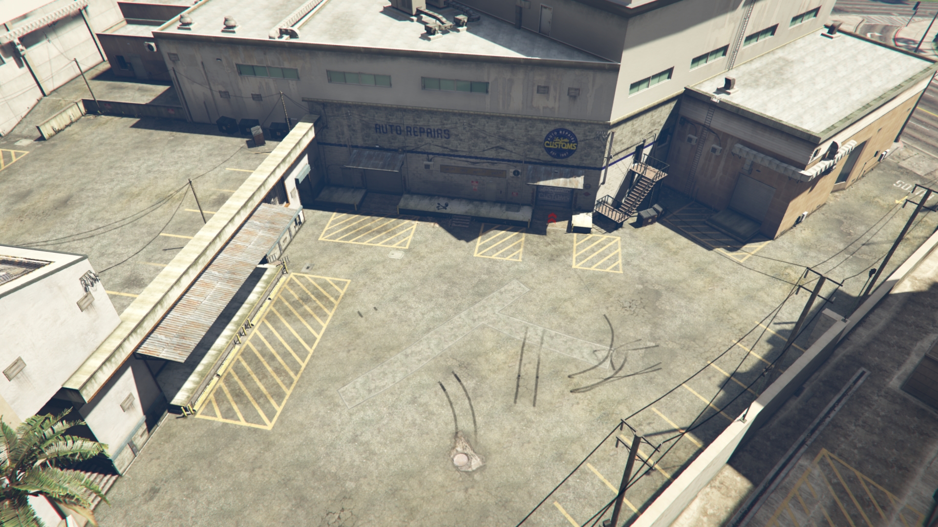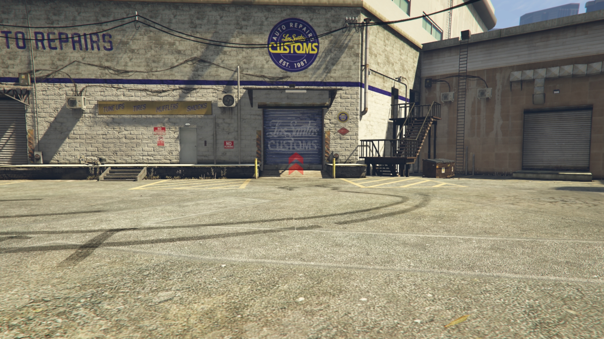 Der Eingang befindet sich bei dem Garagentor mit der Aufschrift "Los Santos Custom". Du musst mit deinem Fahrzeug in die rote Markierung fahren, um die Tuningwerkstatt betreten zu können. Das Betreten ist nur ohne Beifahrer und Passagiere möglich.