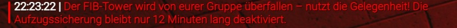 Zeitgleich bekommen die Polizei und das F.I.B über ihre Leitstelle eine Meldung, dass ein Raubüberfall auf den FIB Tower gestartet worden ist und werden versuchen, diesen aufzuhalten. Hierbei können durch die Leitstelle 4 Staatsfraktionisten mehr zugewiesen werden, als Bündnismitglieder online sind. Um aus dem FIB Tower zu flüchten, kannst du den Aufzug benutzen, mit dem du hoch gefahren bist oder du nimmst den hinteren Aufzug und flüchtest durch die FIB Garage. Um nun EXP für die Aktion sowie die Beute selbst zu erlangen, muss der User seine Aktionstasche erfolgreich an der Base seiner Gruppierungabgeben.