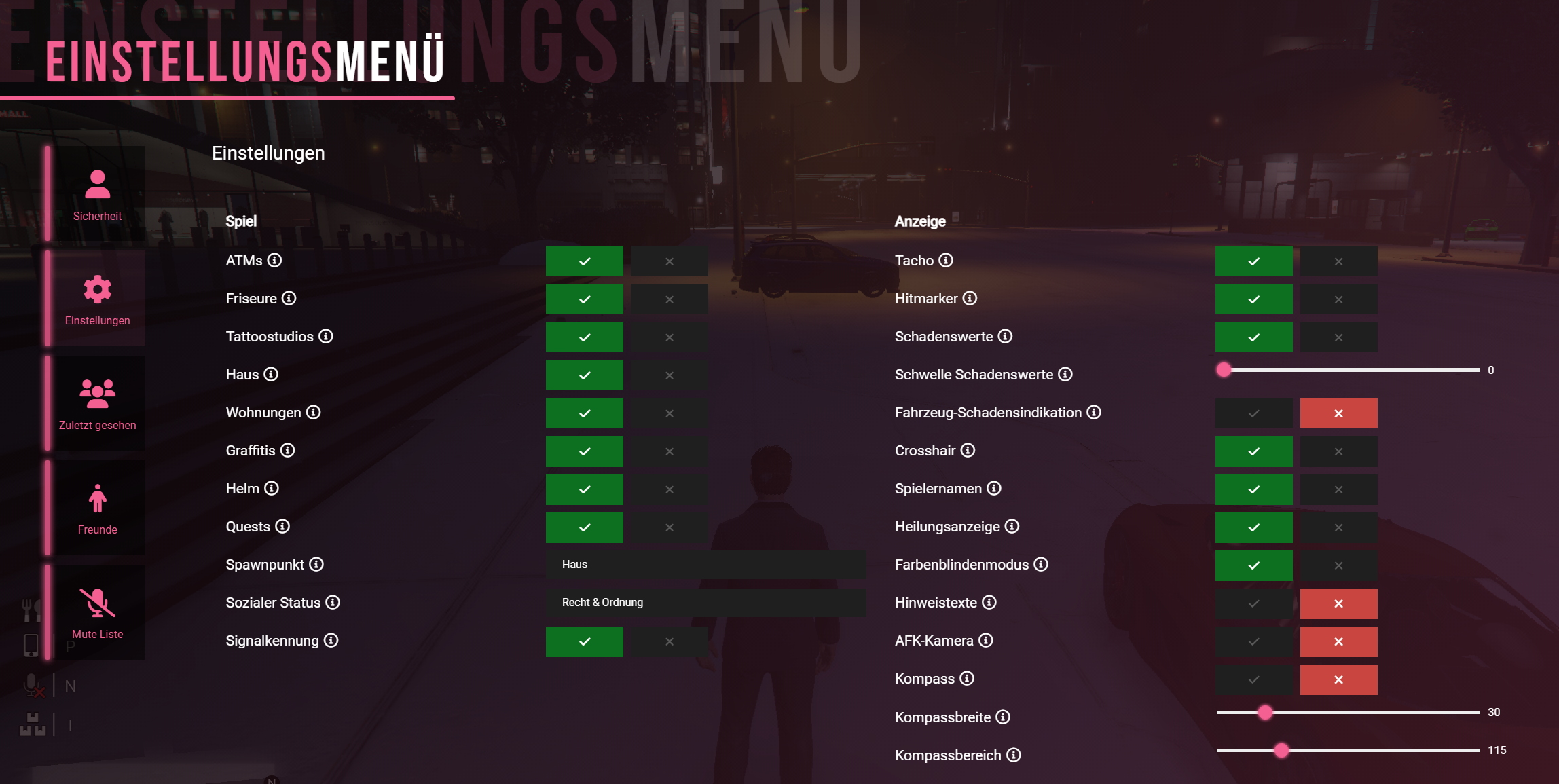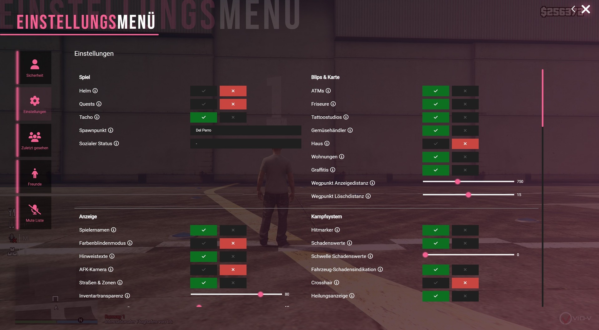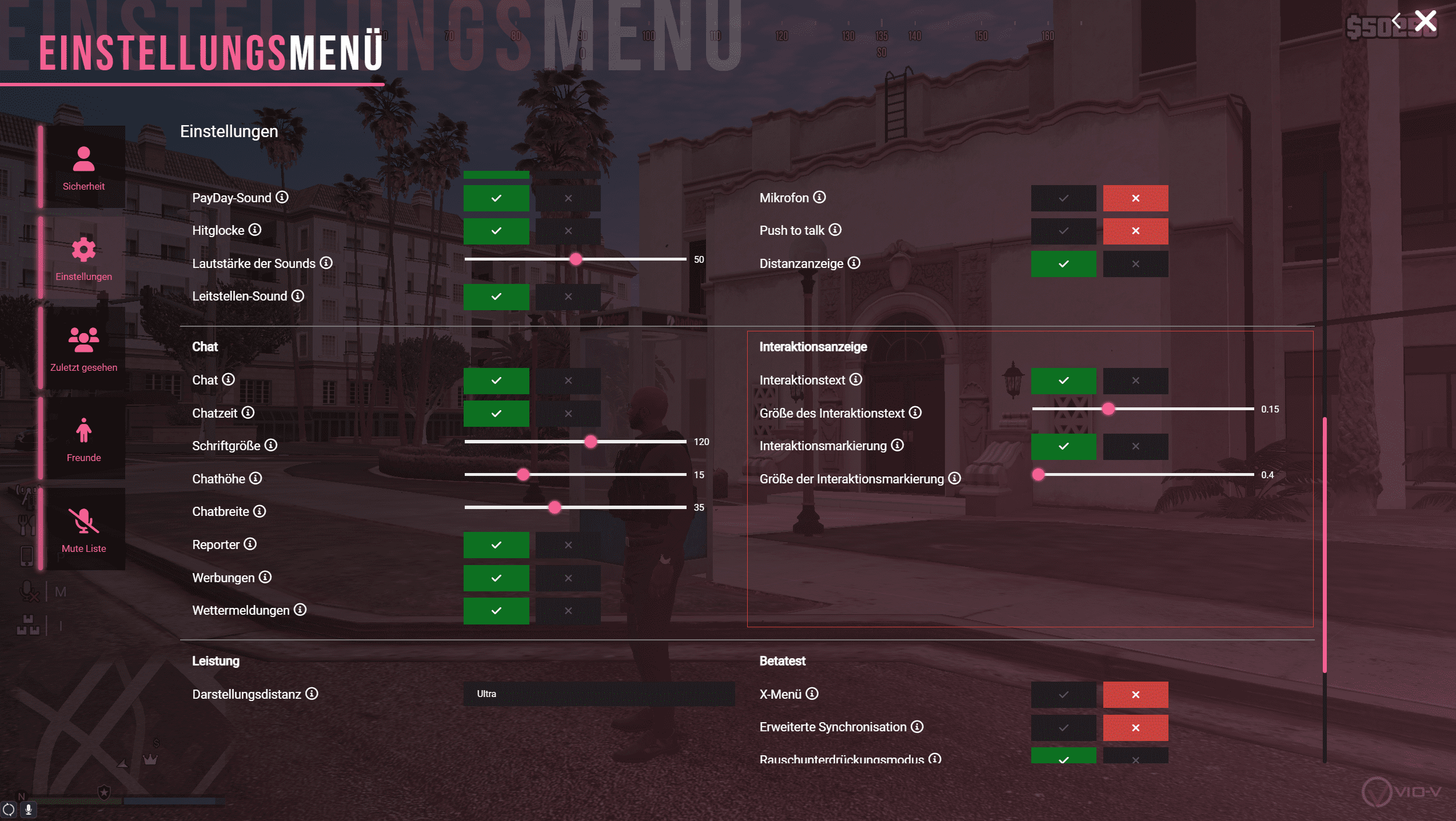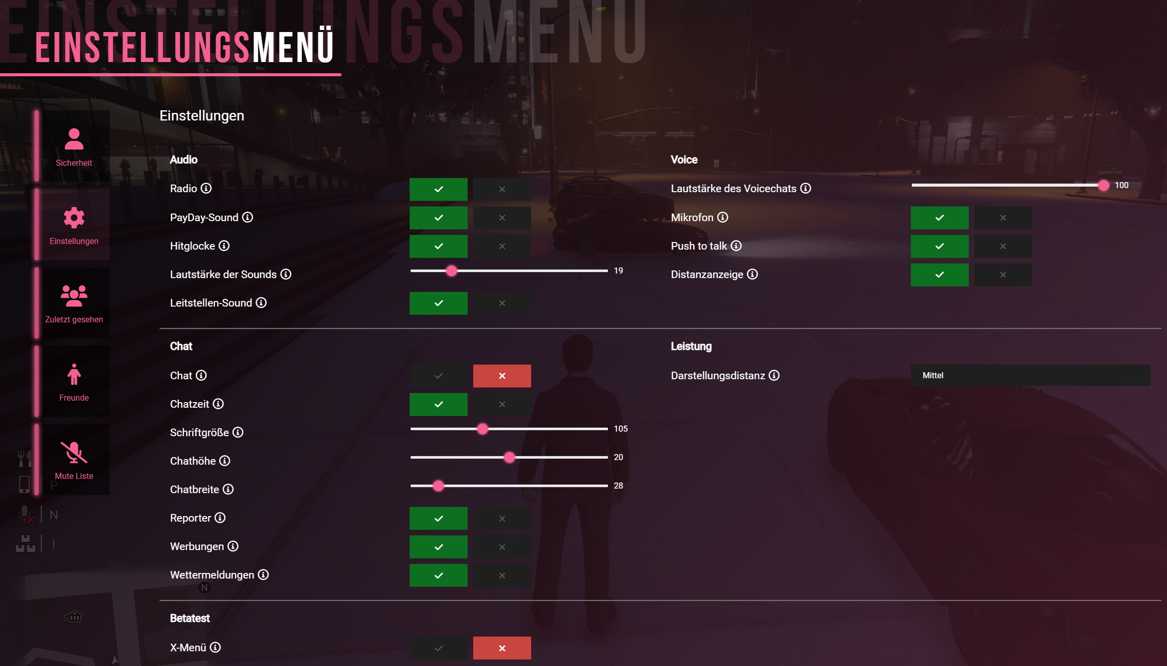 | Überweisungs-Benachrichtigung | Steuert, ob du eine Chatmeldung und einen Hinweiston erhältst, wenn dir ein anderer Spieler Geld überweist. Wenn deaktiviert, werden keine Hinweise angezeigt. |