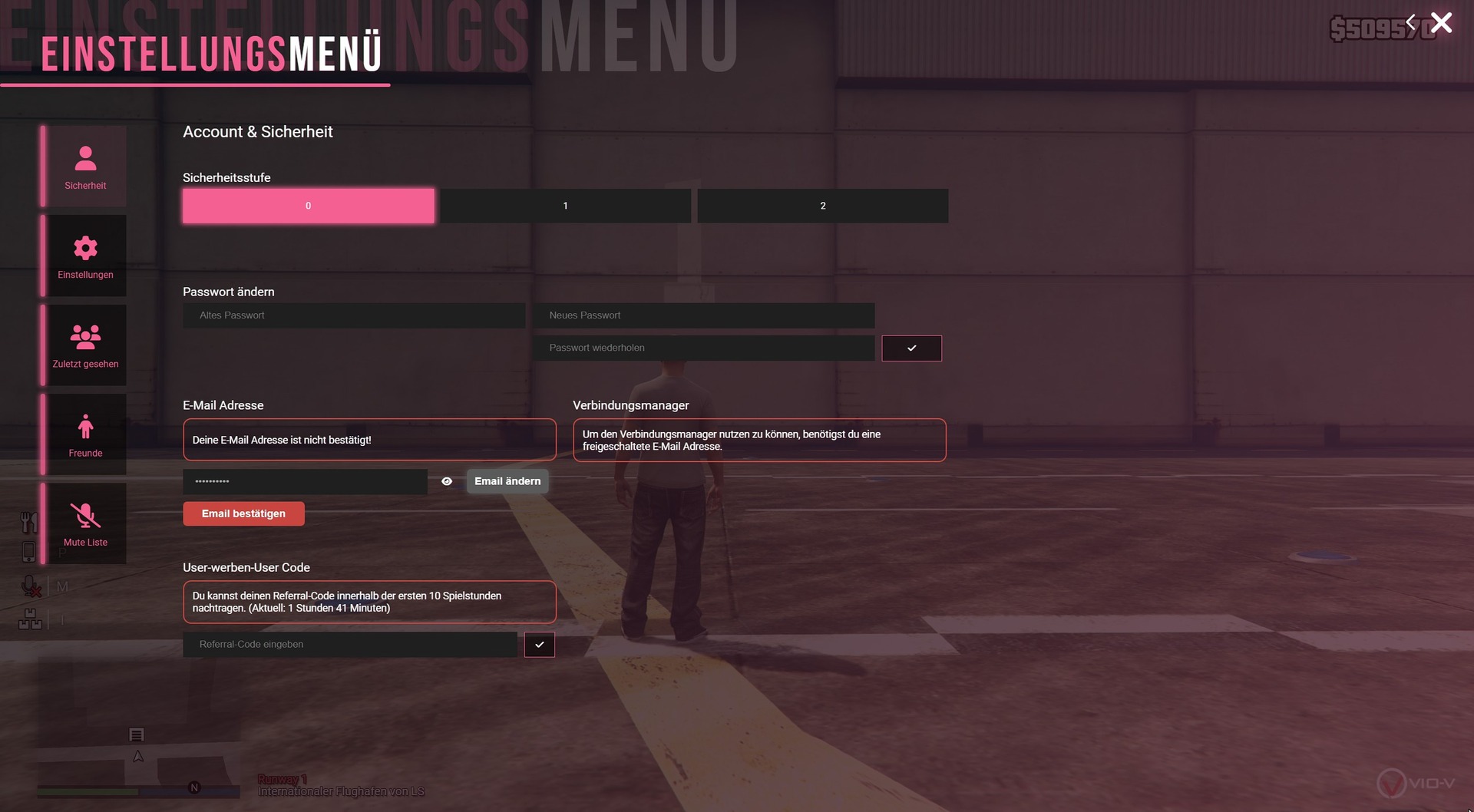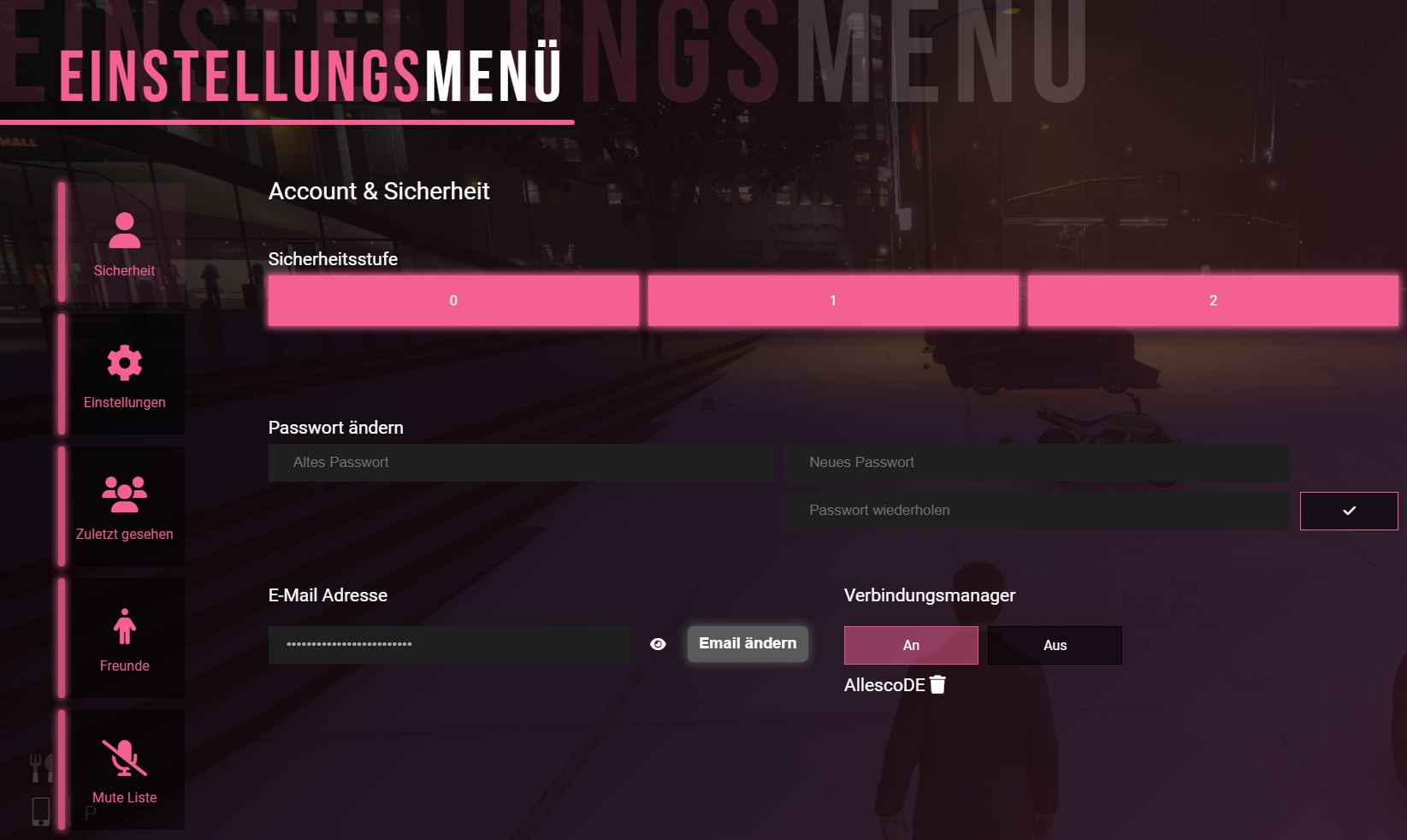 | E-Mail Adresse ändern | Zeigt die aktuell verknüpfte E-Mail Adresse des Accounts an. Diese lässt sich an dieser Stelle ändern. |