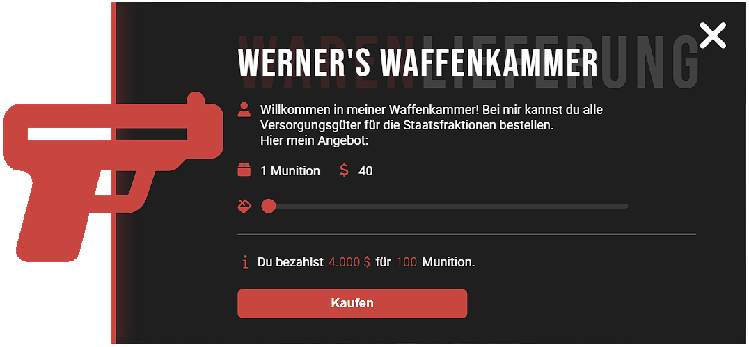 Die Auswahl geschieht mittels Schieberegler in einem sich extra öffnenden Fenster und kann alle 30 Minuten wiederholt werden. Das benötigte Geld wird dabei automatisch aus der Staatsfraktions-Kasse genommen. Es können maximal 3.000 Schuss C-Munition, 3.000 Schuss D-Munition und 1.500 Schuss E-Munition gelagert werden.
