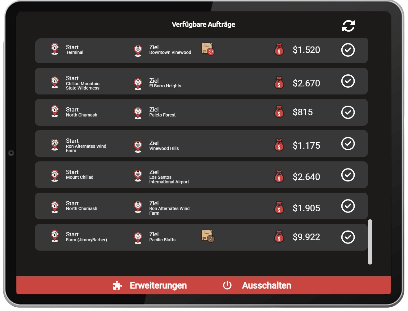 Um im Level aufzusteigen, musst du eine bestimmte Anzahl an Erfahrung (EXP) sammeln. Um den Job anzunehmen, muss der rote Marker beim blauen LKW-Symbol betreten werden. Im nachfolgenden Menü-Fenster kann ausgewählt werden, welches der freigeschalteten Level gespielt werden soll.