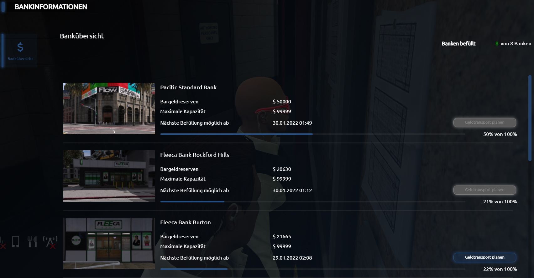 Im Infofenster sind alle Banken des Staates jeweils mit den Informationen Bargeldreserven, Maximale Kapazität und Nächste Beladung möglich ab aufgelistet. Um nun einen Transport zu starten ist ein Klick auf Geldtransport planen bei der entsprechenden Bank nötig. Im Folgenden muss der Beamte auswählen, wie viel Geld transportiert werden soll und wie viele Begleitpersonen dabei involviert sein sollen. (Fairplay System)