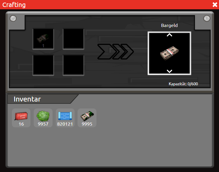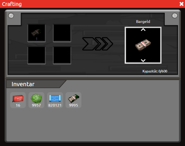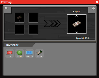 Um das markierte Geld aus eurem Lager in verwendbares Bargeld umzuwandeln, müsst ihr dieses mittels des Craftingmenüs waschen. Hierfür öffnet ihr das Craftingmenü und stellt mittels Klick auf einen der Pfeile auf das Craftingrezept für Bargeld um. Für den Vorgang benötigt ihr markiertes Geld, welches dann letztendlich 1:1 als Bargeld wieder rauskommt. Weitere Informationen zum Crafting könnt ihr im Beitrag Gruppenallgemeines einsehen.