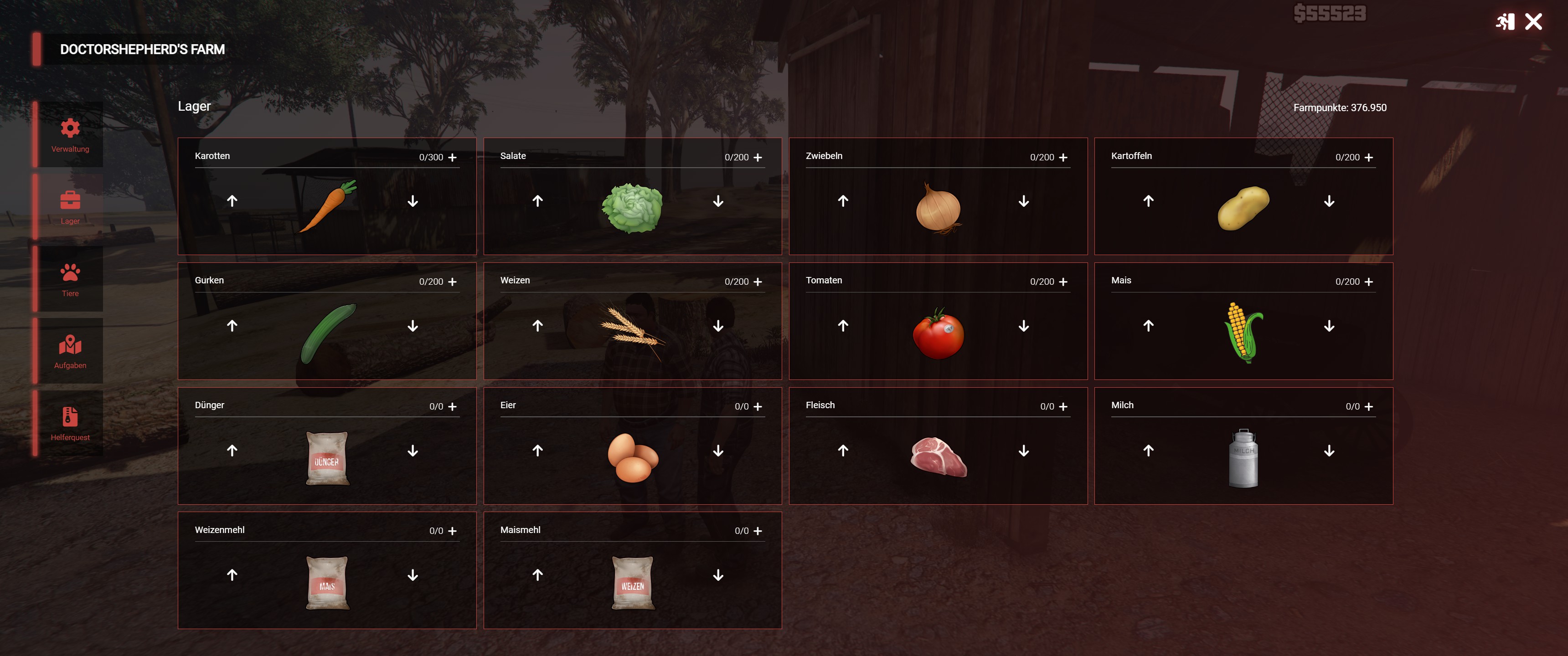 Im Lager können die Gemüsesorten sowie Tierischen Produkte ein- und ausgelagert werden. Dazu muss das jeweilige Gemüse oder die Tierart erst freigeschaltet werden. Ist ein Gemüse oder Tier freigeschaltet, so kann anschließend auch das entsprechende Lager erweitert werden.