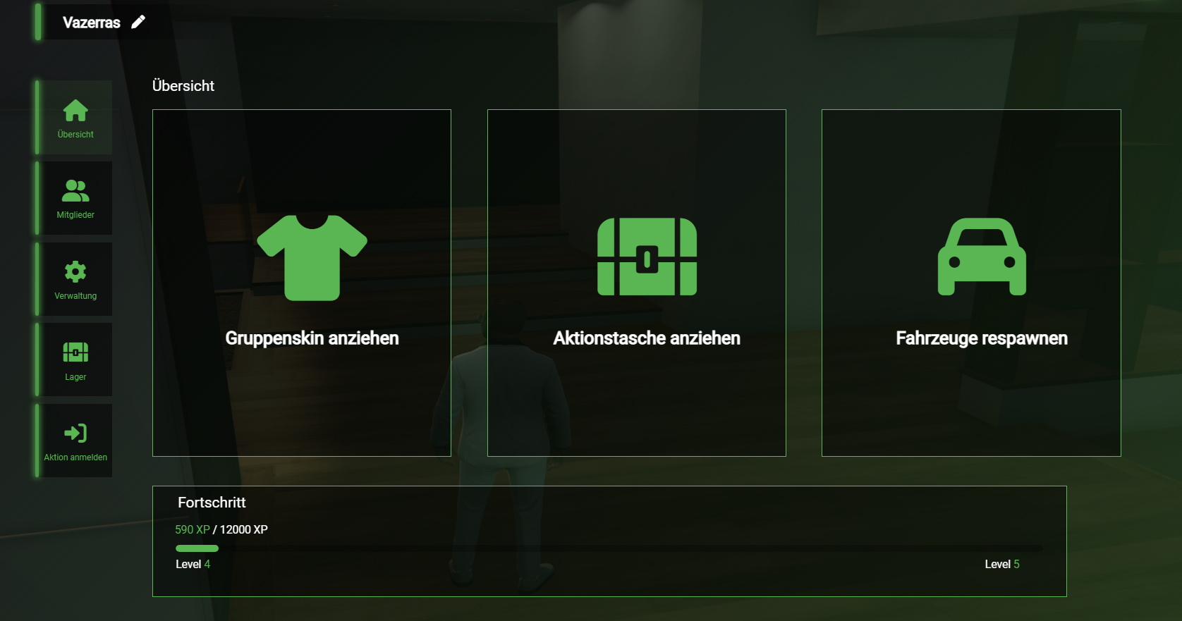 Die Aktionstasche kann über das Gruppenmenü ausgerüstet werden. Um die Tasche Über das Gruppenmenü anzuziehen, musst du dich in deinem Gruppenhaus befinden. Das Gruppenmenü öffnest du durch das Eingeben von /group oder durch Drücken der Taste F4 Mit einem Klick auf Aktionstasche anziehen kannst du die Aktionstasche an- oder ausziehen. Eine Aktionstasche ist Hauptbestandteil einiger Gruppenaktionen. Solltest du Aktionen mit der Aktionstasche machen, erhältst du für deine Gruppe EXP. Deine EXP sind essenziell für dein Gruppenlevel und sind im Gruppenmenü im Reiter Übersicht einzusehen.