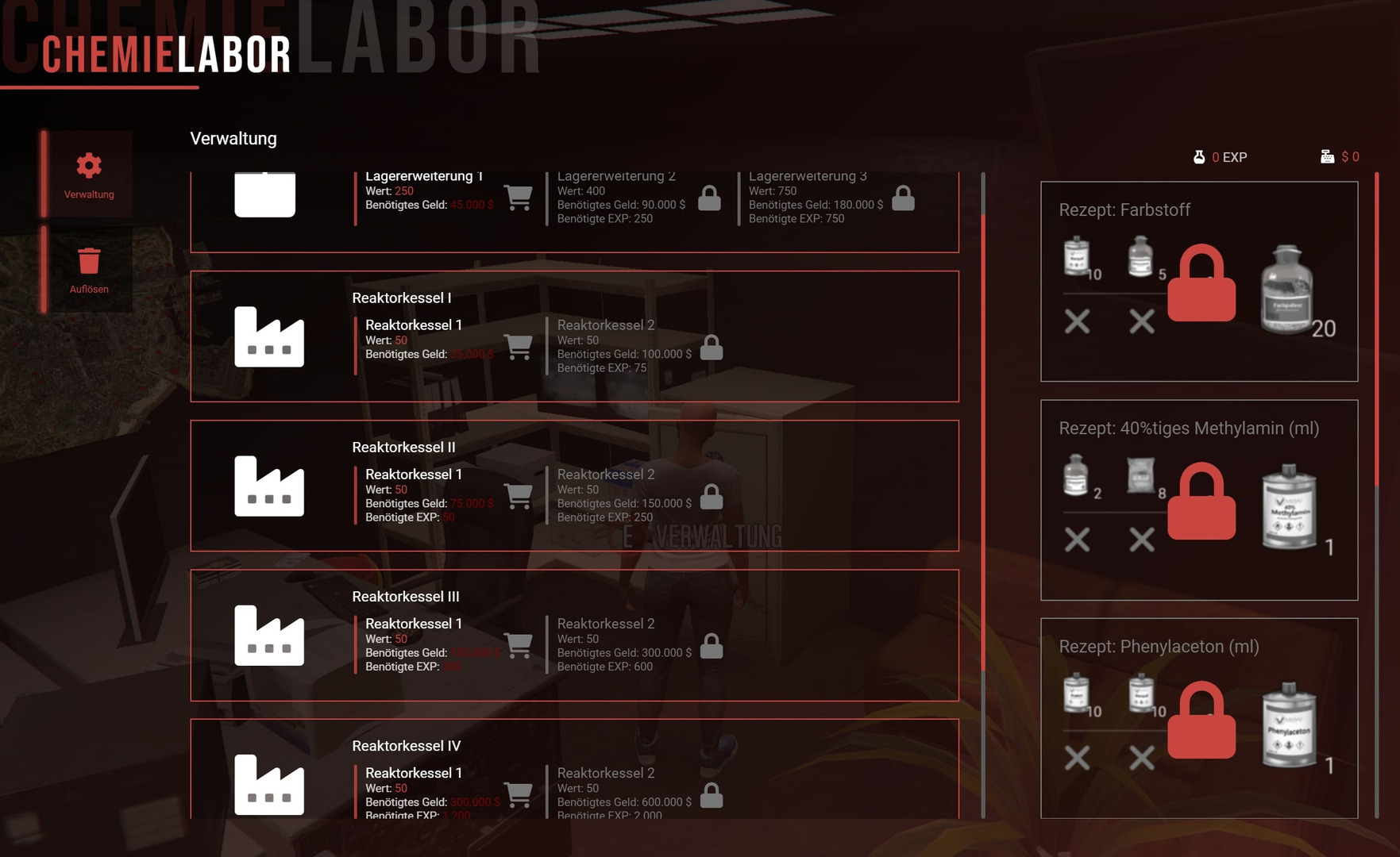 Mit einem Chemielabor ist es deiner Gruppierung möglich, mit verschiedenen Ressourcen, Chemikalien herzustellen. Um eine Produktionshalle als Chemielabor zu eröffnen benötigt ihr $125.000 und 150 GangExp. - das Geld wird im Squadlager benötigt.