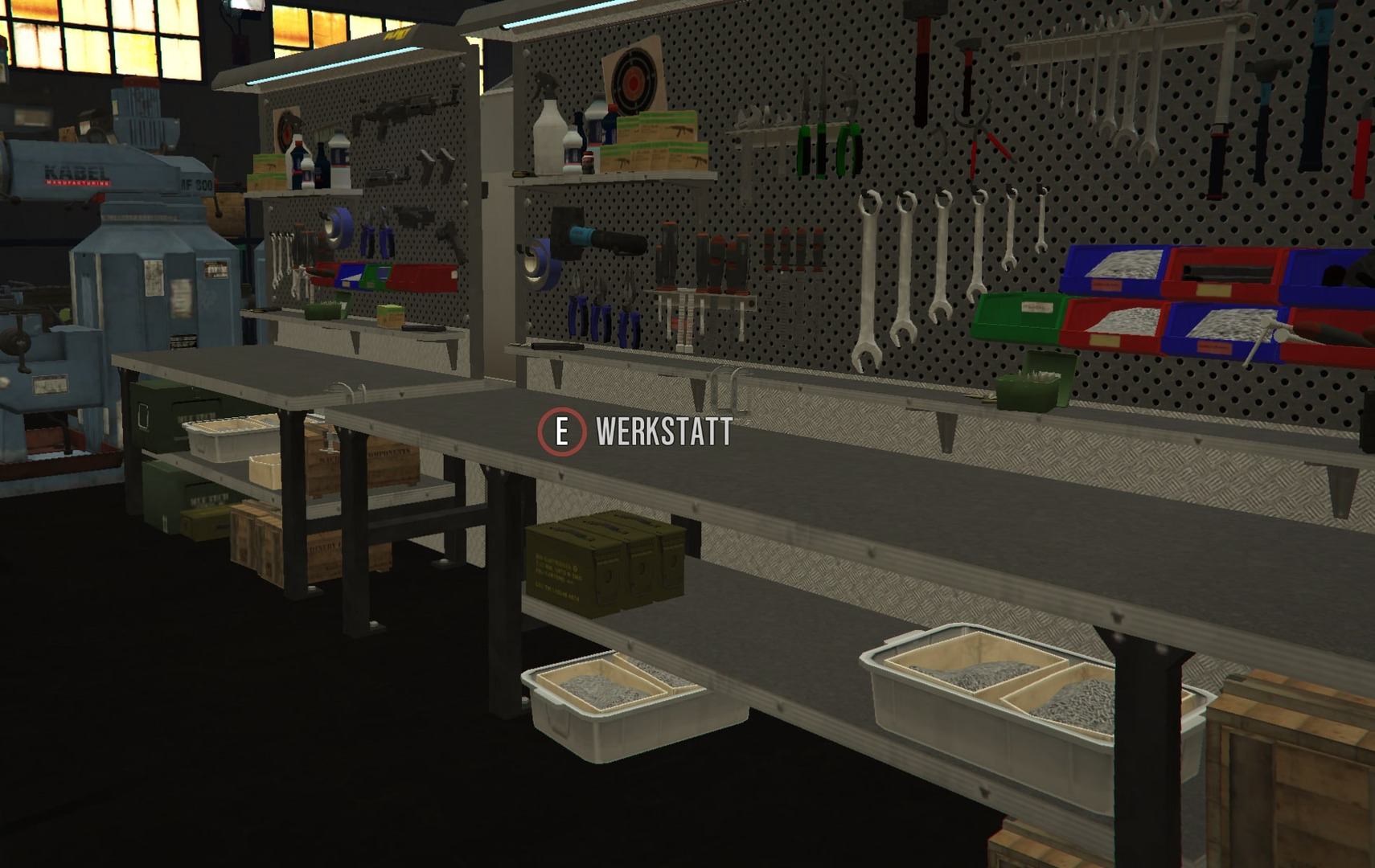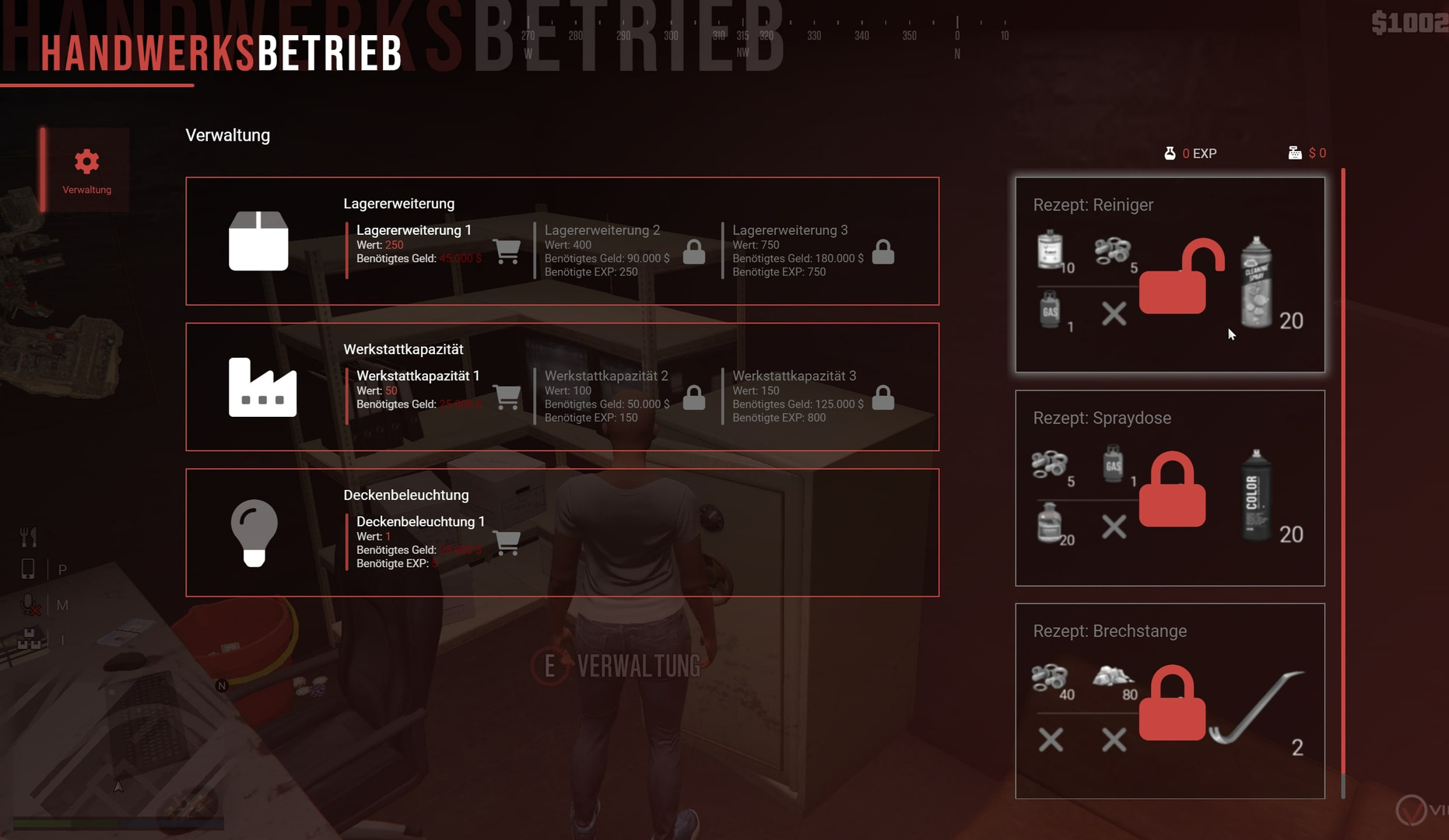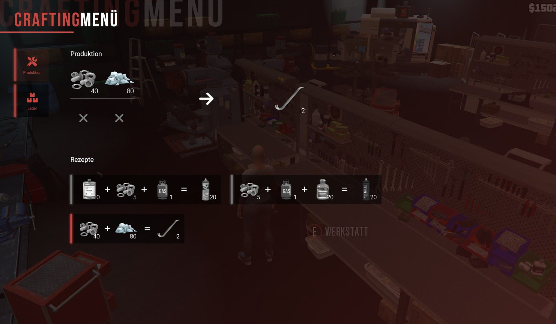 Nach dem Erwerb der Produktionshalle müsst ihr diese für eure Zwecke einrichten. Dies bedeutet, dass ihr für den Herstellungsprozess im Chemielabor einen Reaktorkessel und für den Herstellungsprozess im Handwerksbetrieb eine Erweiterung der Werkstattkapazität benötigt. Ihr habt nun die Möglichkeit zu dem jeweiligen Objekt zu gehen um dort die Produktionsaufgabe festzulegen. Das Menü des Herstellungsprozesses öffnet man mit E. Für den Vorgang der Herstellung müssen sich die benötigten Gegenstände im Lager der Werkbank befinden - die hergestellten Gegenstände landen auch im Werkbanklager. Bedenke: Das Rezept muss freigeschaltet sein!
