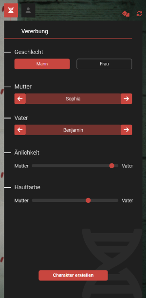Im Abschnitt "Vererbung" hast du die Möglichkeit, eine Vielzahl von Anpassungen in Bezug auf Geschlecht, Herkunft sowie Ähnlichkeiten zu Mutter und Vater vorzunehmen.