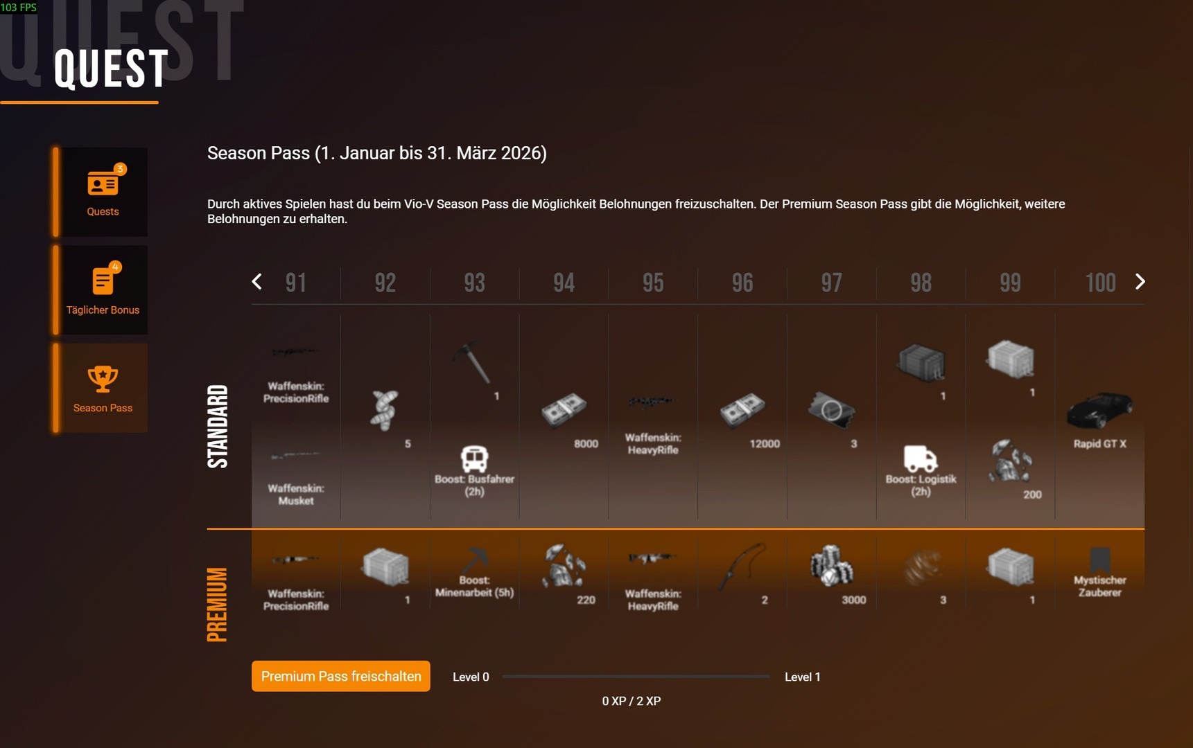 Um im Season Pass Fortschritte zu erzielen, musst du nicht viel machen. Neue Level werden automatisch erreicht, indem du aktiv an Aktivitäten & Aktionen teilnimmst. Dies kann beispielsweise das Abschließen täglicher Quests, das Durchführen von Jobs, Squad- und Gangaktionen, Aktionen des LSSDs & LSPDs, des LSFDs sowie der Weazel News umfassen. Aber auch durch den täglichen Bonus bei 2, 4, 6 sowie 8 Stunden erhält man zusätzliche Season Pass EXP.