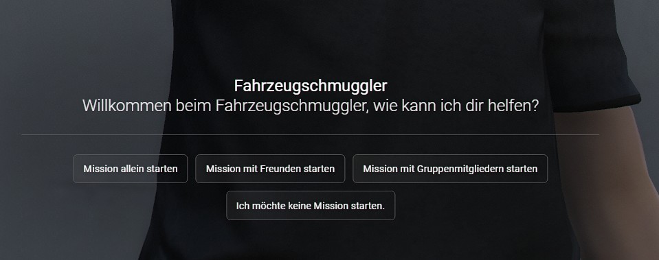 Wenn du den Schmuggel starten möchtest, musst du zum Fahrzeugschmuggler gehen und mit ihm sprechen. Daraufhin öffnet sich das Interaktionsmenü, in dem du die Aktion starten kannst. Hier hast du folgende Auswahl: