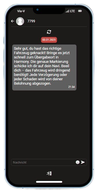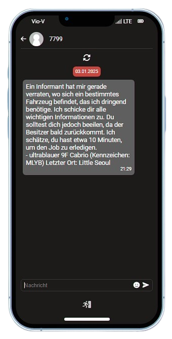 Nachdem du mit dem Schmuggler gesprochen hast, erhältst du innerhalb weniger Minuten (1–5 Minuten) eine SMS auf dein Handy mit den benötigten Informationen zum Fahrzeug. Folgende Informationen erhältst du: