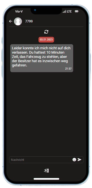 Max Mustermann nimmt einen Auftrag beim Fahrzeugschmuggler an. Zu diesem Zeitpunkt sind 8 Polizisten online. Mit seinem Level 2 erhält er den Auftrag, ein Mittelklassefahrzeug zu stehlen. Er begibt sich zum Fahrzeug, schlägt die Scheibe ein und schließt es kurz. Der Abgabeort befindet sich 4,9km in Luftlinie entfernt. Am Abgabeort angekommen, übergibt er das Fahrzeug mit 80% Zustand, da er auf dem Weg einige Unfälle hatte.
