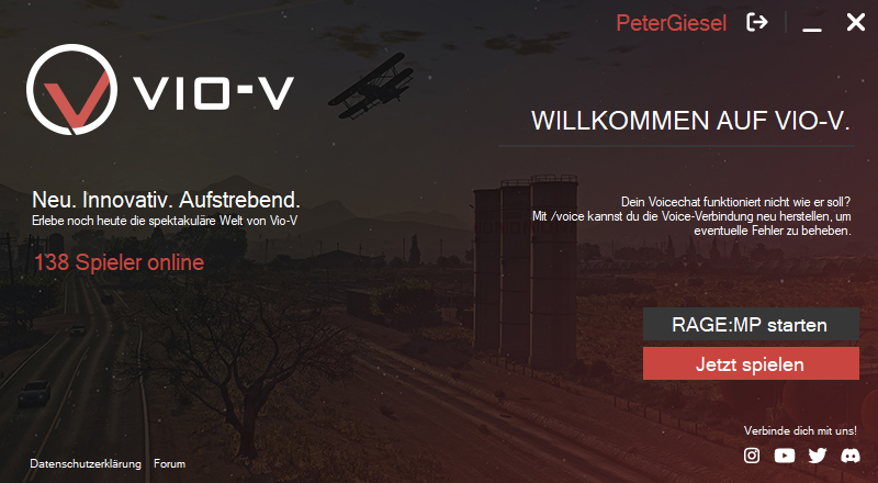 Der Vio-V Launcher ermöglicht dir, auf den Vio-V Gameserver zu verbinden und weist dich unter anderem auf Programme hin, die dein Spielerlebnis auf Vio-V negativ beeinflussen können (z. B. Programme die verantwortlich für vermehrte Spielabstürze sind). Im Discord wird in deiner Aktivität "Spielt Vio-V" angezeigt und du musst dein Passwort nicht mehr im Login Screen im Spiel eingeben.