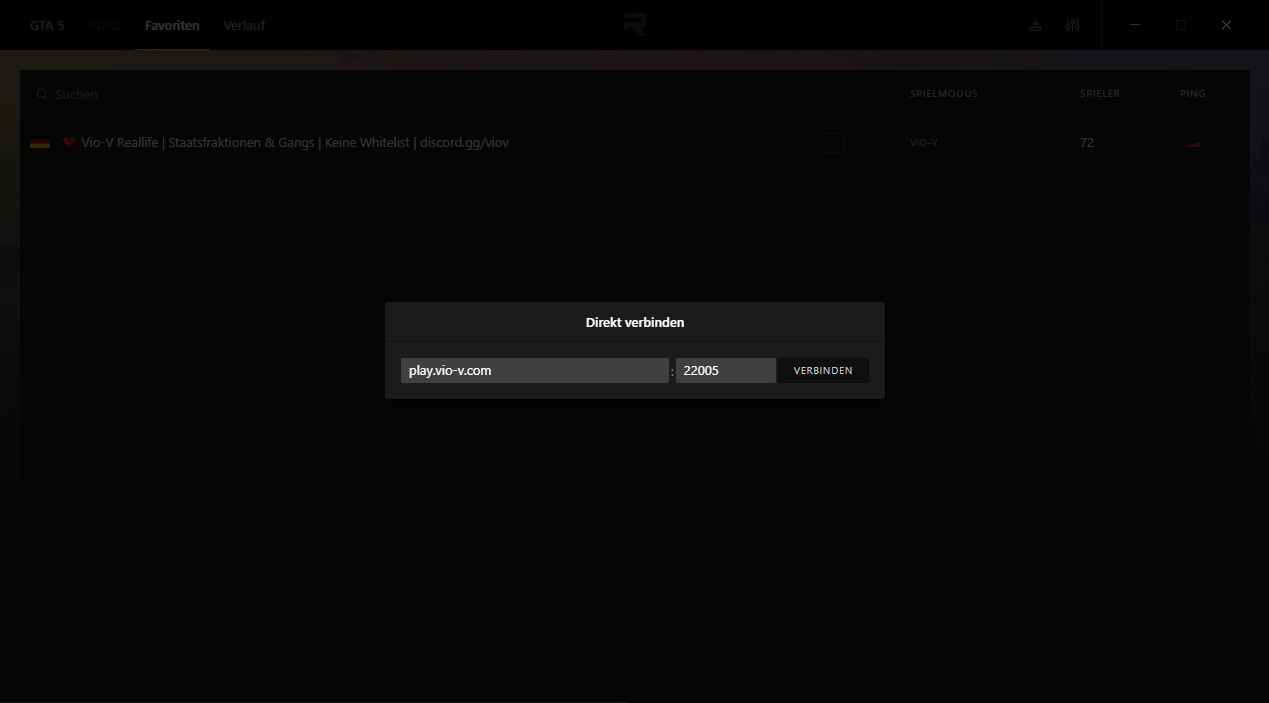 Für den Einstieg reicht das Verbinden über den RAGE:MP-Client zunächst aus. Wir empfehlen jedoch ausdrücklich die Nutzung des Vio-V Launchers, da dieser später zwingend erforderlich ist, sobald du einer Fraktion oder Gruppe beitrittst. Dann ist ein Joinen über den reinen RAGE:MP-Client nicht mehr möglich.