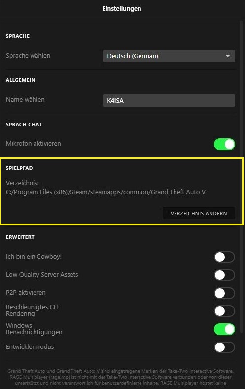 | GTA-V Verzeichnis | Es wird das GTA-V-Verzeichnis angezeigt und kann bei Bedarf geändert werden. WICHTIG: GTA-V Enhanced wird aktuell noch nicht unterstützt und kann daher nicht über den Launcher ausgewählt werden. Das ist jedoch kein Problem, der Start ist wie bisher über RageMP möglich. |