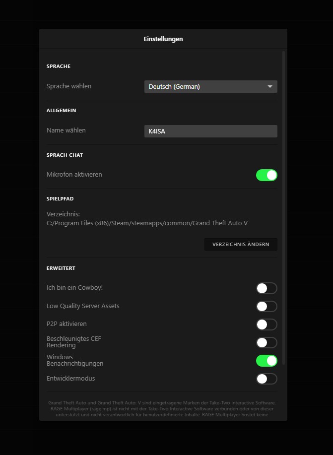 GTA-V VerzeichnisEs wird das GTA-V-Verzeichnis angezeigt und kann bei Bedarf geändert werden. WICHTIG: GTA-V Enhanced wird aktuell noch nicht unterstützt und kann daher nicht über den Launcher ausgewählt werden. Das ist jedoch kein Problem, der Start ist wie bisher über RageMP möglich.