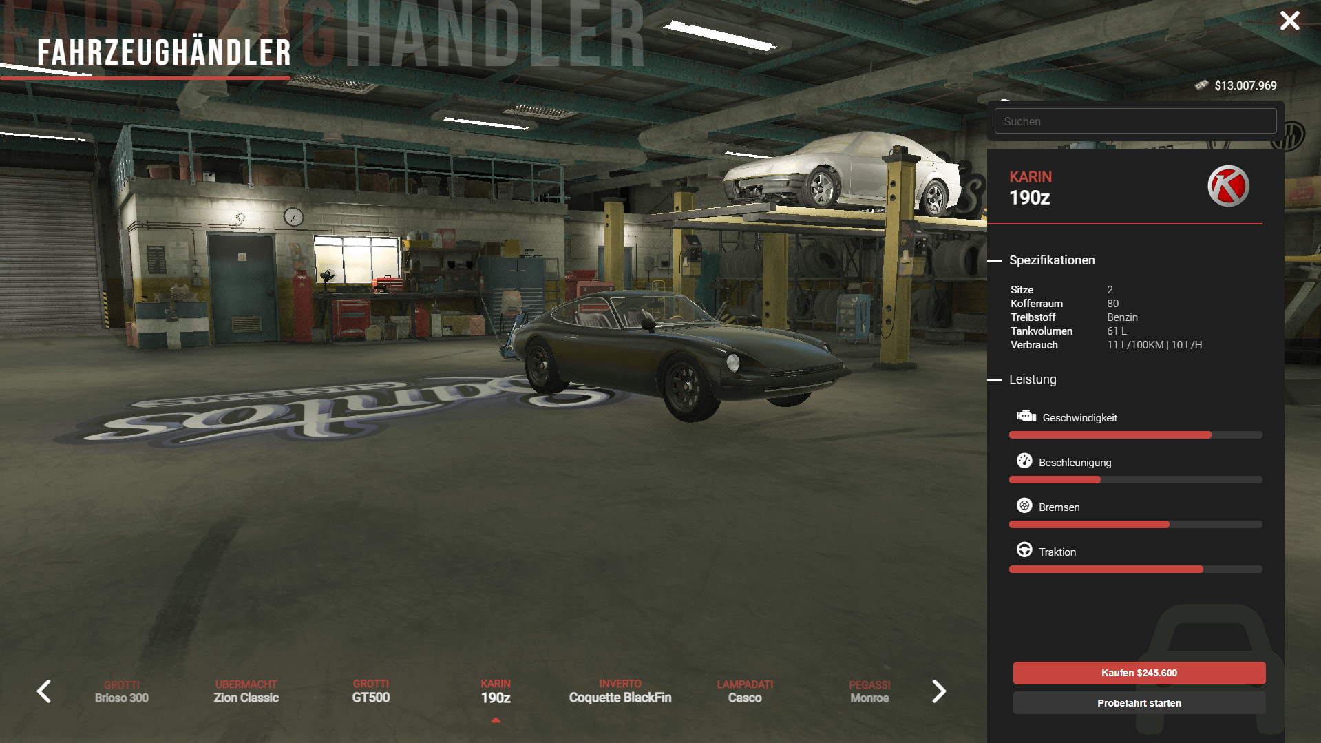 | GT500 | Grotti | $255.800 | 80 | Spoiler anzeigenMotor 1: $25.580 | $63.950 | ![]() |