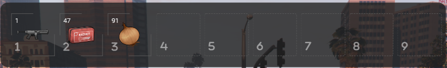 | Über die Quick-Use-Leiste kannst du die wichtigsten Gegenstände ablegen, die du direkt brauchst. Über die Tasten 1-9 kannst du diese dann automatisch benutzen, egal ob es deine Waffen, Essen oder Medikits sind. Sollte man in so einen Slot ein Item ziehen, so wird auch die gespeicherte Tastenbelegung überschrieben und es wird das Item verwendet. Die Belegung bleibt nach einem erneuten Verbinden gespeichert. So hast du alles schnell griffbereit und musst nicht jedes Mal dein Inventar öffnen. |