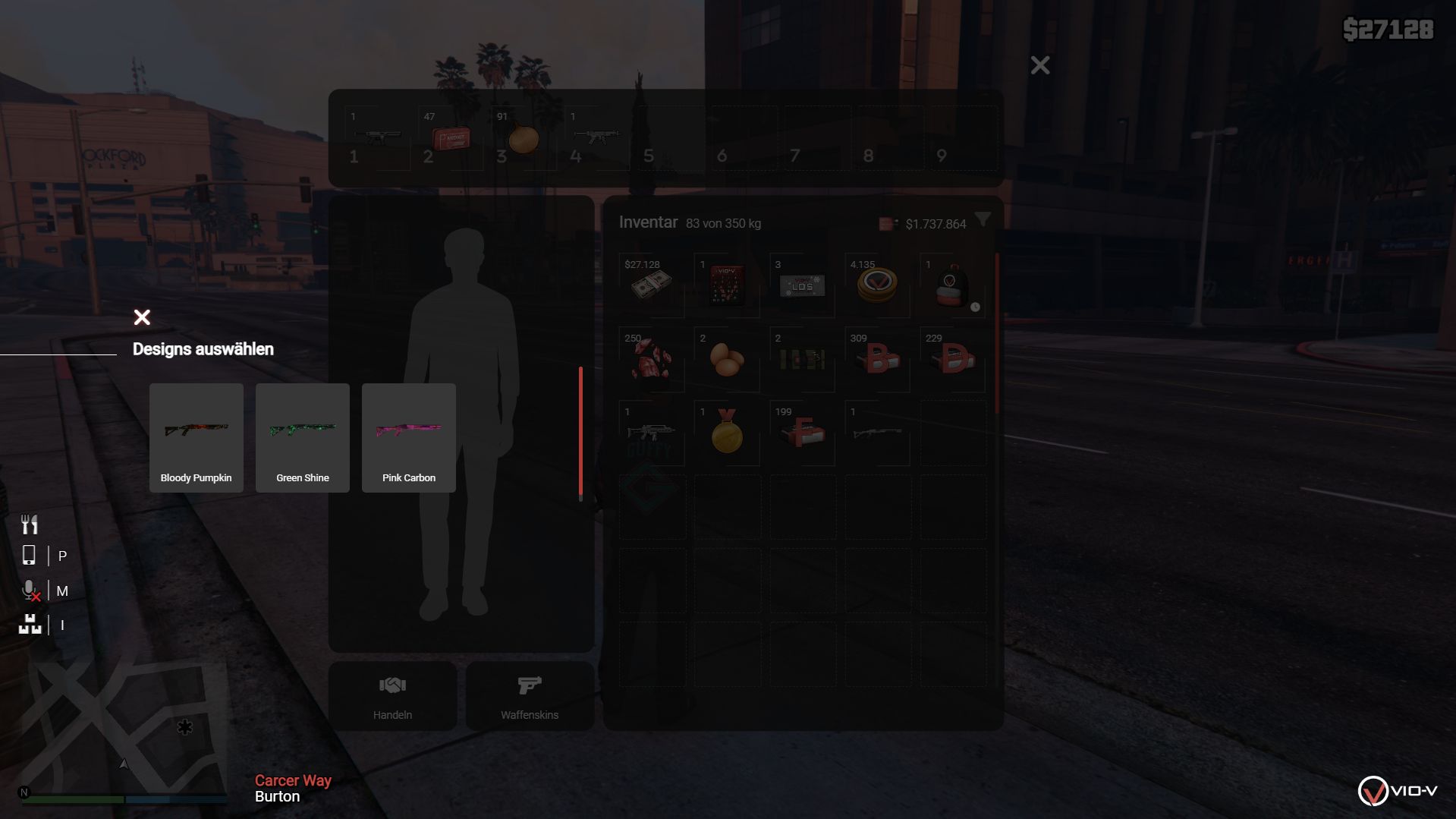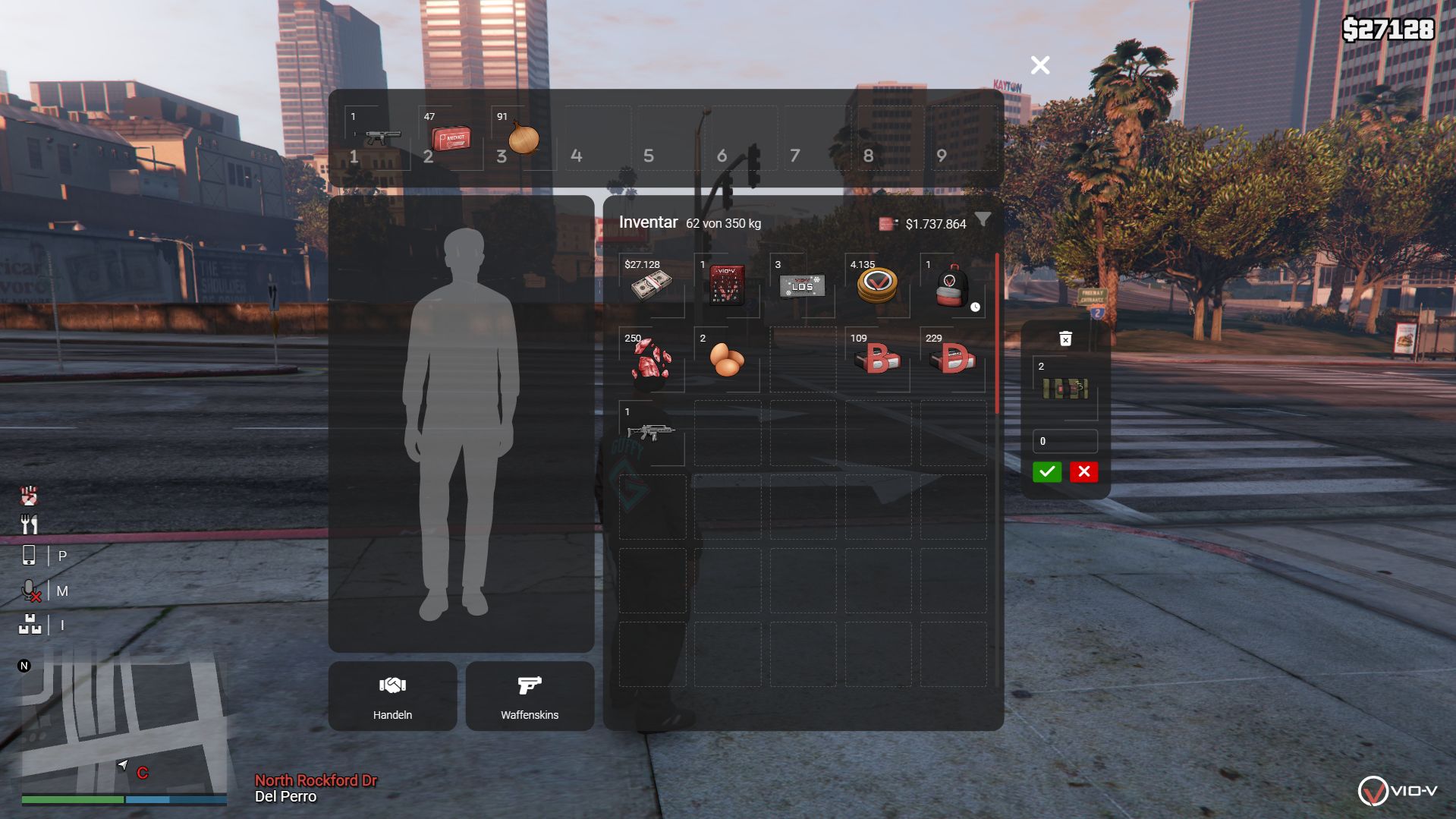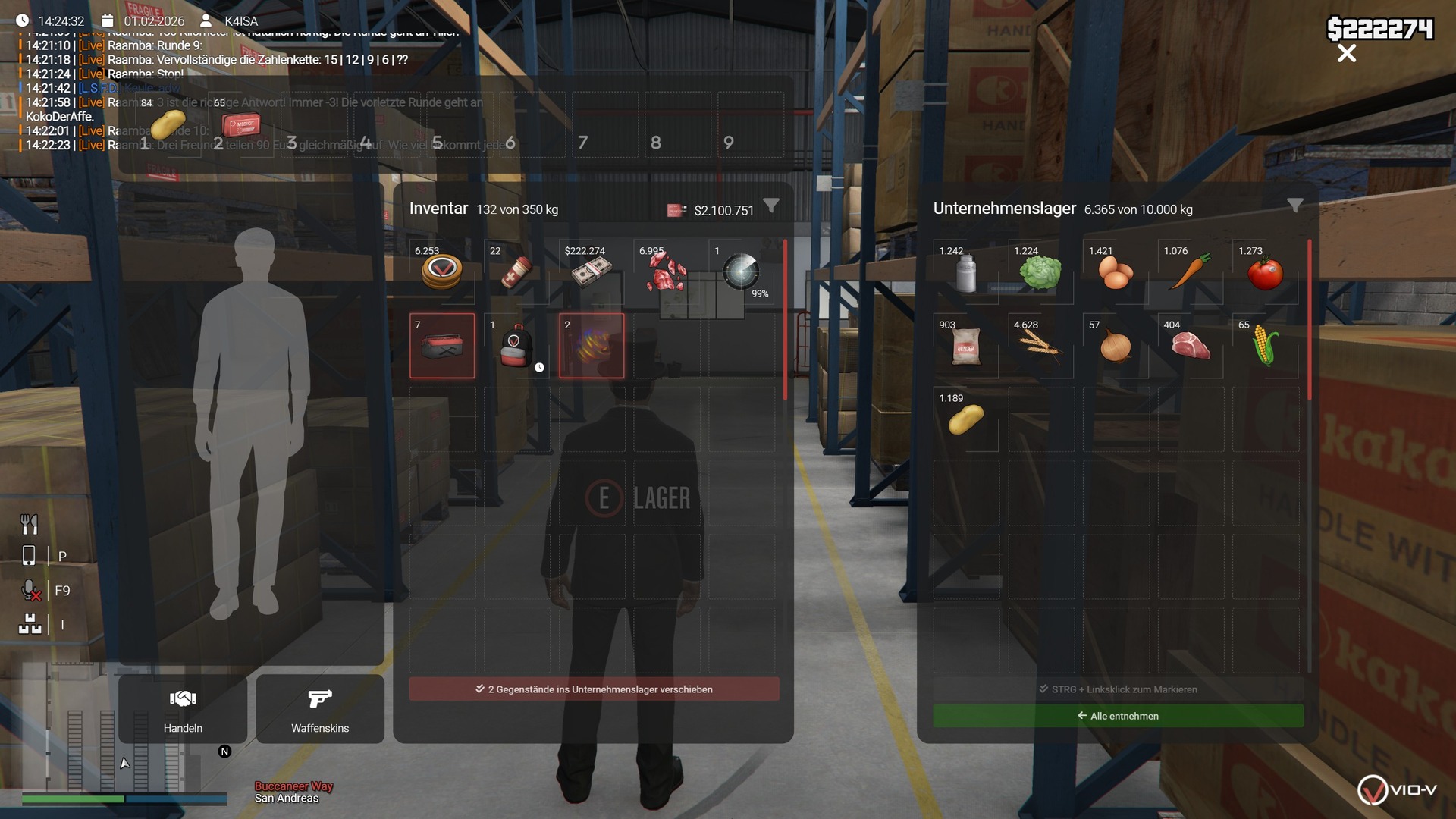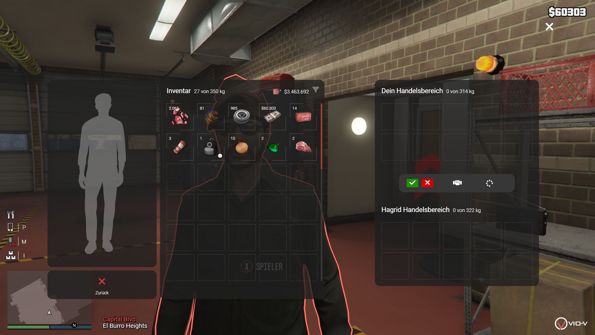 Du kannst mehrere Items gleichzeitig auswählen. Dadurch musst du Gegenstände nicht einzeln verschieben, sondern kannst sie gesammelt handeln. Wenn ich dir zum Beispiel Eier und Fleisch handle, erscheinen diese automatisch im Handelsfenster. Das funktioniert mit STRG + Linksklick, dabei wird alles markiert, was du anklickst. Items können in allen Inventaren (Spieler, Fraktionslager, Kofferraum etc.) per Drag & Drop innerhalb desselben Inventars umsortiert werden. Die Reihenfolge bleibt nach Schließen des Inventars und nach Reconnect erhalten. |