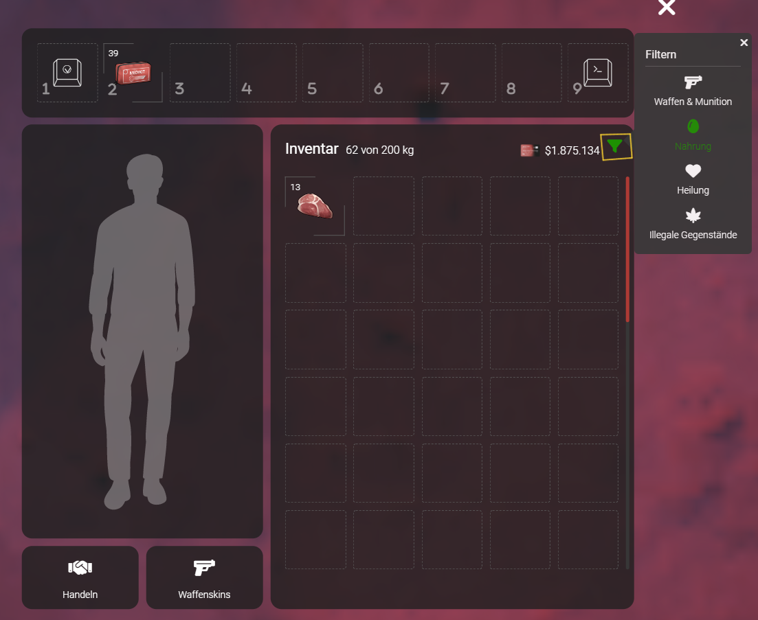 | Du kannst einen Filter aktivieren, der dir Kategorien wie Waffen & Munition, Nahrung, Heilung und illegale Gegenstände anzeigt. Sollte dein Inventar zu voll sein und du einen Gegenstand nicht direkt finden kannst, klicke einfach oben rechts auf das Trichter-Symbol. Das Overlay kann entweder durch einen Klick auf das X oder durch einen erneuten Klick auf den Trichter geschlossen werden. |