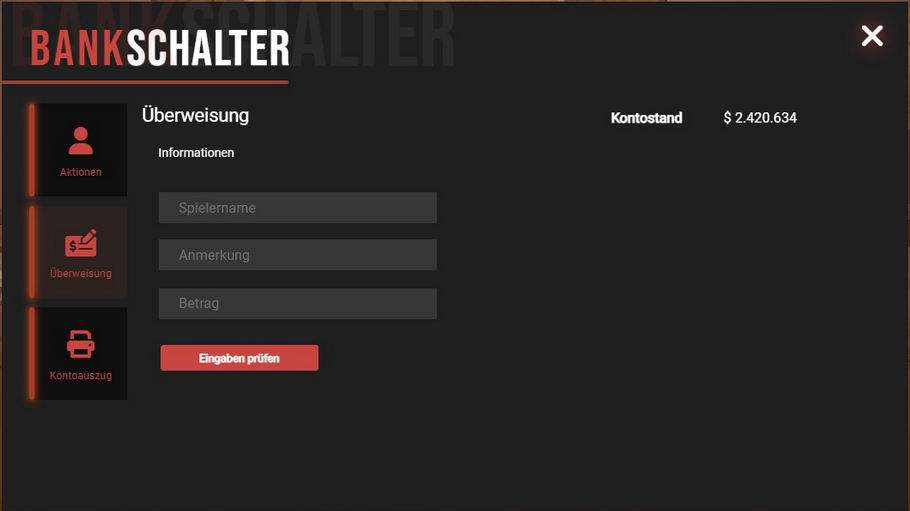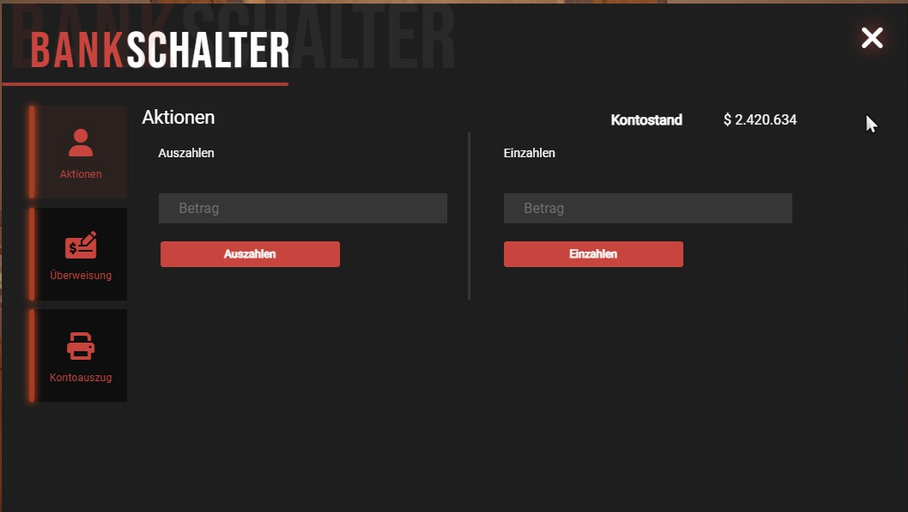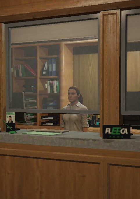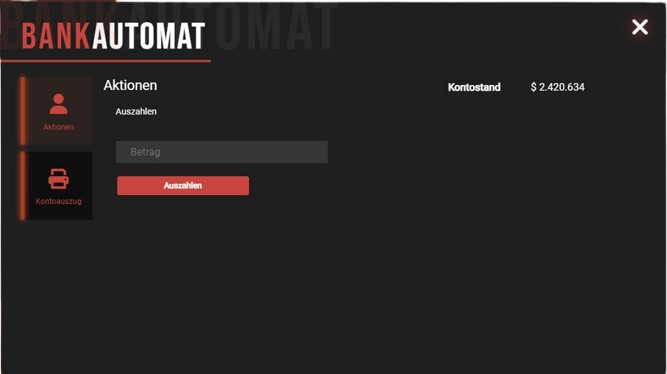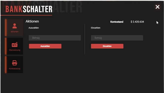 Bei einem Bankschalter kann man Bargeldeinzahlung/-abhebung , sowie Überweisungen durchführen. Gehe hierfür in eine beliebige Bank und drücke, bei dem Bankangestellten, die Taste E um mit diesem zu interagieren.
