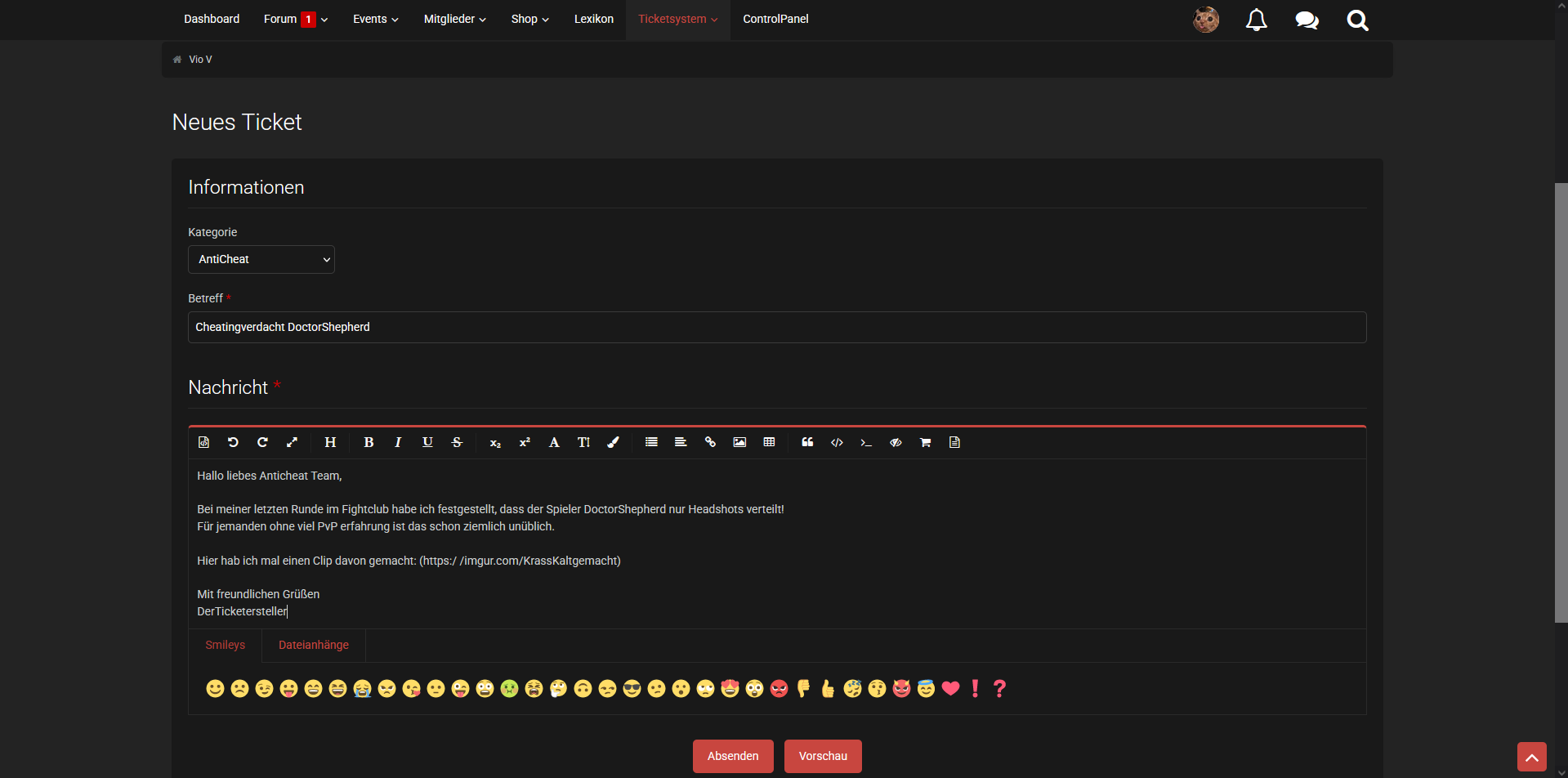 In diesem kannst du direkt Kontakt mit unserem eigenes dafür aufgebauten AntiCheat-Team aufnehmen. Dieses Teammitglied wird sich deiner Sache so schnell wie möglich annehmen und all seine zur Verfügung stehenden Mittel dafür einsetzten, um berechtigte Verstöße entsprechend zu sanktionieren.