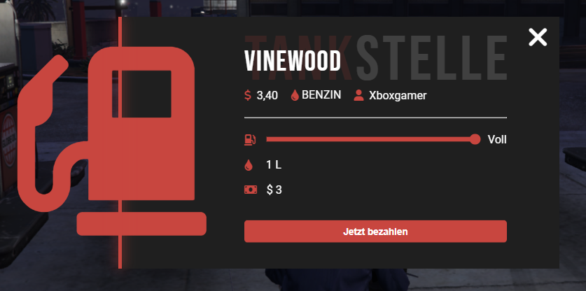 In diesem GUI kannst du nun dein Fahrzeug voll, oder auch nur bis zu einem gewissen Punkt betanken - dies kannst du mit einem einfachen Regler selbst bestimmen. Ebenfalls wird dir nun angezeigt, wie hoch der Preis je Liter ist und wie viel Geld du nun zahlen musst.